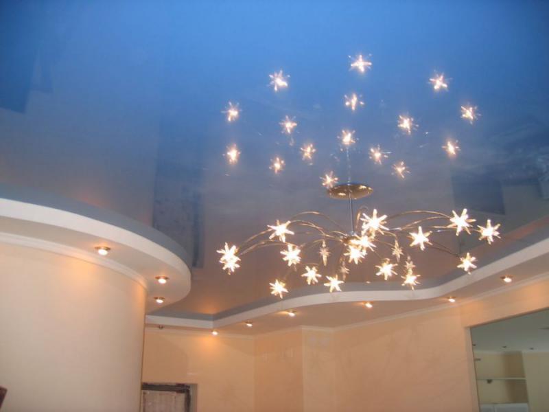 Существует немало способов декоративно оформить натяжной потолок: с помощью методов фотопечати, создания эффекта звёздного неба, а также применения многоцветных вариантов плёнки.