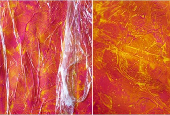 Используя пленку можно создать уникальный принт на стенах. Для этого, нанесите на стену слой краски, приложите пленку, активно помните ее и снимите.