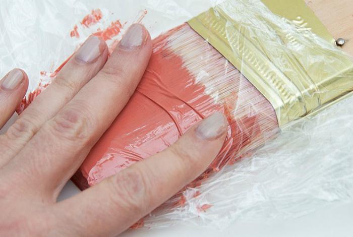 Если вы планируете продолжить малярные работы на следующий день, оберните кисть пищевой пленкой и положите в холодильник. Такая хитрость не позволит кисточке задубеть. Кстати той же пищевой пленкой можно прикрыть банку с краской, чтобы та не загустела.