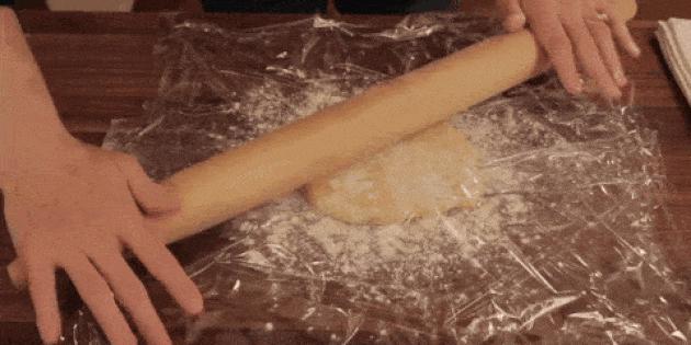Одним листом застелите стол или разделочную доску, другим накройте тесто. Потребуется сноровка, но оно того стоит. И стол, и скалка останутся чистыми.