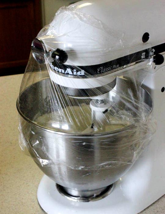 Оберните миску погружного блендера или миксера пищевой пленкой, чтобы защитить ближайшие поверхности от брызг.