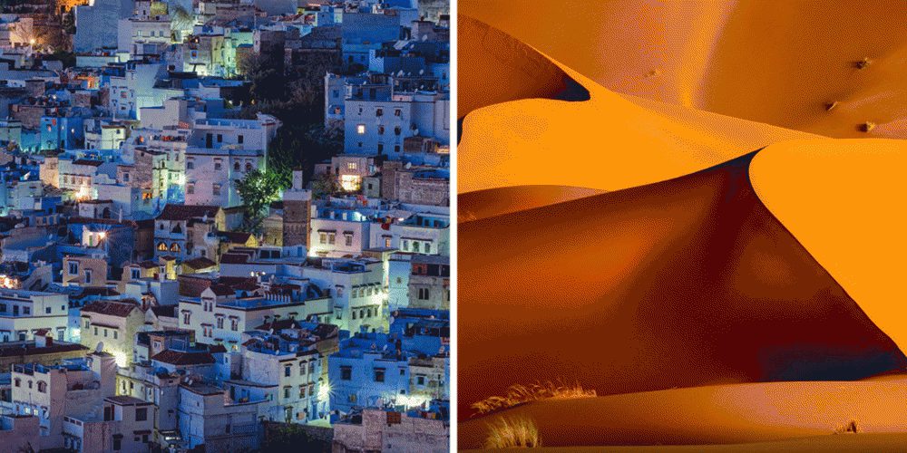 Марокко — это голубой город Шефшауэн, невероятно красивый пляж Легзира с огромными природными арками из марсианского красного известняка на побережье Атлантического океана, знаменитый на весь мир город Марракеш с его дворцами и площадью Джема-Эль-Фна, с заклинателями змей и многообразием африканских звуков. Обязательно стоит посетить город на берегу Атлантики Эль-Сувейра, в котором много лет жил Джимми Хендрикс, где чайки и синие лодки, потрясающе вкусная рыба, которую готовят прямо на берегу.