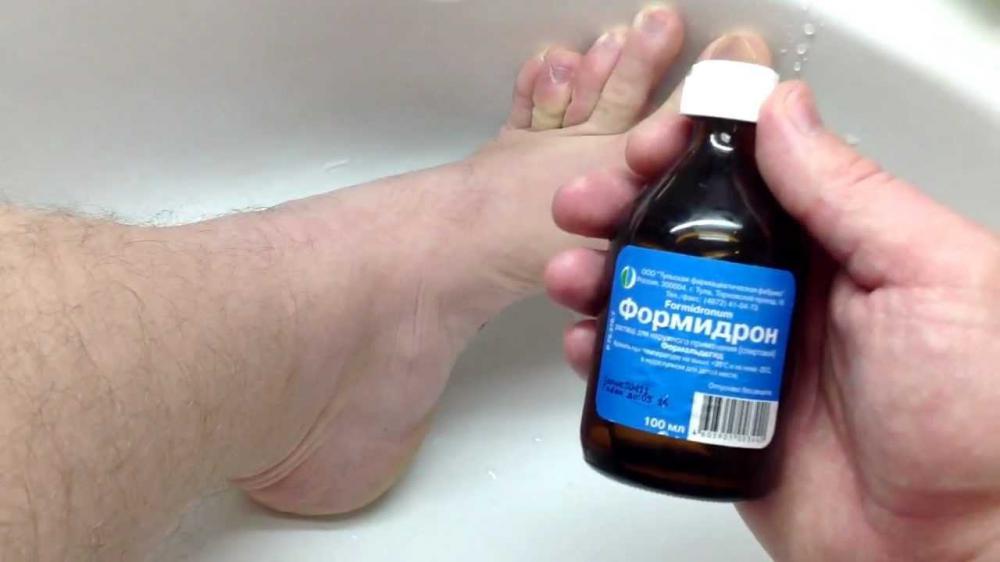- Раствор формалина (5%) смешивают с настойкой йода (2%) и протирают места наибольшей потливости между пальцами ног и ступни.