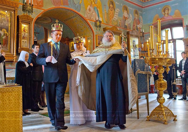 Под пение "Слава Тебе, Боже наш, слава Тебе!" жених и невеста, ведомые священником, переходят в центральную часть храма.