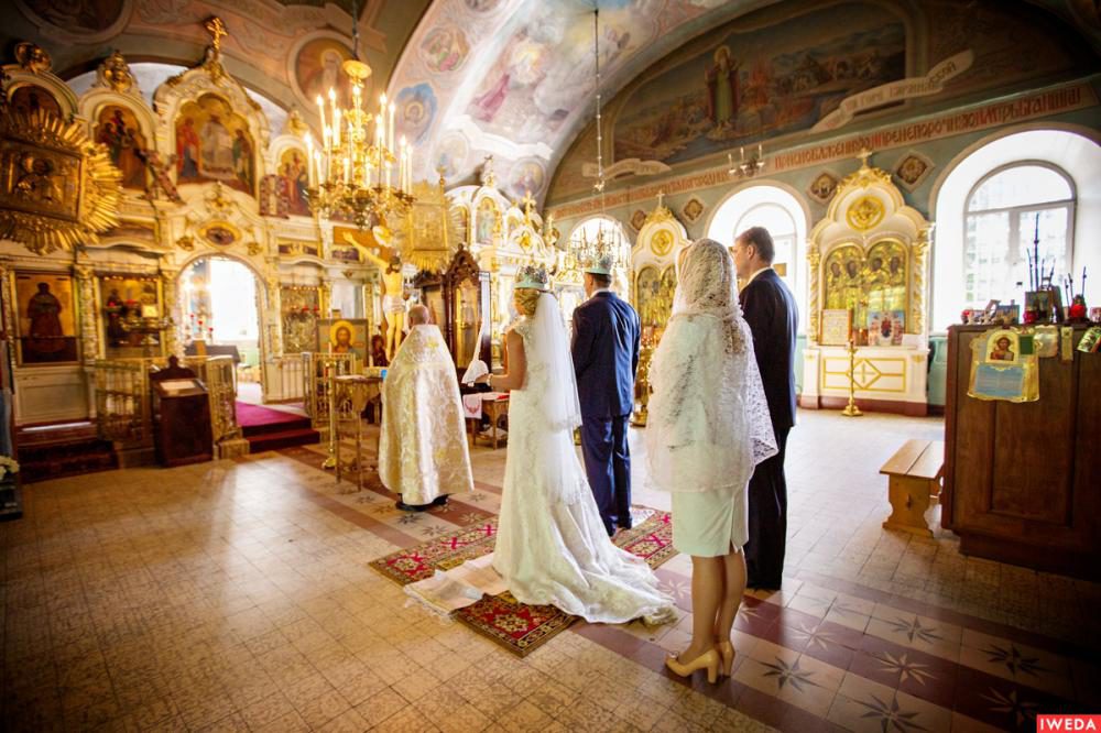 Красивым! Конечно, здесь есть некоторые ограничения - невеста не должна быть в брючном костюме, а ее платью не следует быть излишне декольтированным. Невеста обязательно должна быть покрыта фатой, газовым шарфом или платком. Венчание потому так и называется, что в церкви на молодых одевают венцы - церковные короны, поэтому большая шляпа будет смотреться не лучшим образом. Обувь может быть любая, но следует помнить, что на каблуках придется неподвижно стоять довольно долго.