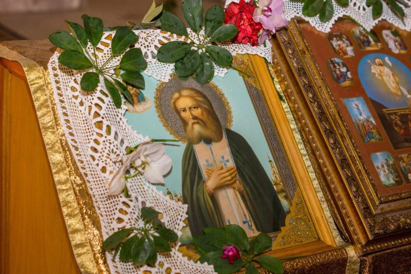 "О великий отче наш Серафим! Удостой милости своей нас, смиренных и немощных, обремененных грехами многими, твоей помощи и утешения просящих. Прояви к нам благосердие твое великое и помоги нам заповеди Божьи исполнять, веру православную крепко в сердце содержать, покаяние во грехах наших усердно Богу приносить, в благочестии христианском преуспевать и достойными быть твоих молитв перед Престолом Господа. Услышь нас, молящихся тебе с верою и любовью, и не оставь нас, о заступничестве твоем просящих: ныне и в час кончины нашей помоги нам, и защити нас молитвами твоими от искушений, от злобных наветов дьявольских, да не коснется нашей души бесовская сила, но да сподобимся помощью твоею Царствия Небесного. На тебя уповаем, отец наш: укажи нам путь у спасению и приведи нас к Свету жизни вечной у Престола Пресвятой Троицы.