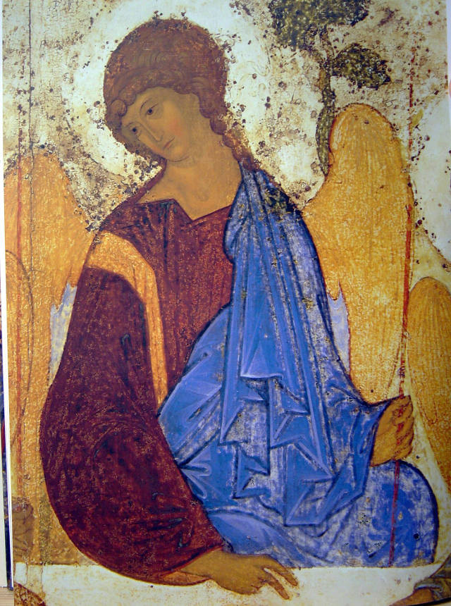 По церковным канонам в центре картины должен находиться Бог-Отец. Но почему тогда Рублев у высшего Бога изобразил меньший по размеру нимб? И почему он одет не в золотой, а в красно0коричневый хитон (цвет почвы, глины)? А почему голубой плащ покрывает лишь половину его тела? Если это полностью небесное существо, то голубая одежда тоже должна покрывать его полностью, как левого и правого Ангелов. Значит это - Богочеловек Иисус Христос. А о приобщении его к Небесному Божеству нам говорит золотой клав на правом рукаве и золотые крылья за спиной.