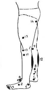 Точку 9 (что на внутренней поверхности коленного сустава, на два поперечных пальца ниже коленной чашечки) используют при заболеваниях печени, желчного пузыря, при люмбаго, при болях в колене.