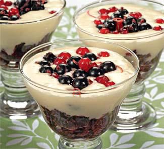 Взбить сливки в плотную пену, добавить к молочному муссу и осторожно перемешать. Вернуть в холодильник. Разложить слоями мусс и ягодную смесь в широкие бокалы, накрыть и поставить на 4 ч в холодильник. Перед подачей украсить ягодами смородины.