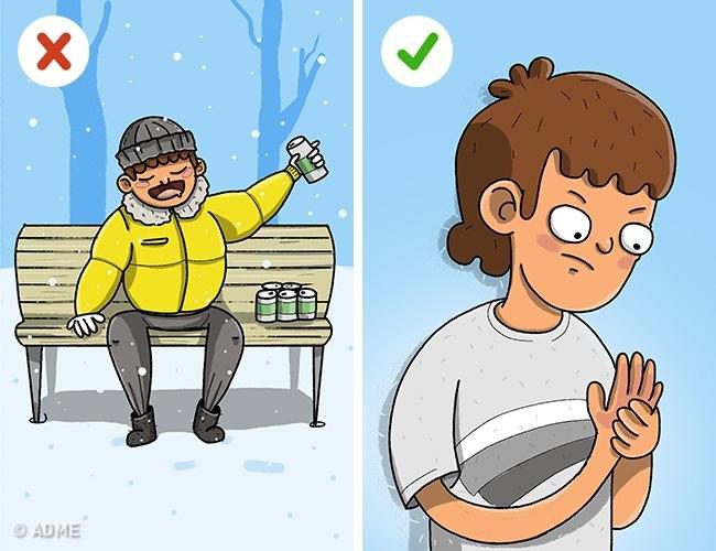 Спиртные напитки значительно снижают ощущение холода и не дадут вам вовремя прочувствовать, насколько вы замерзли. К тому же это может помешать контролю над процессом заживления: по мере согревания должно появиться ощущение покалывания и жжения. Кожа на обмороженных участках сначала должна стать розовой или красной, возможно, с пятнами. Постепенно должны возвращаться привычные ощущения и нормальная текстура кожи.