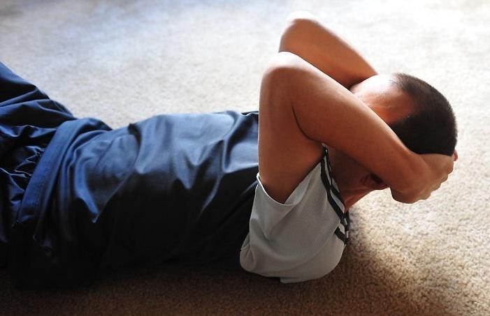 2. Поднимите руки вверх к голове. Возьмите руки в захват за головой... перенесите всю тяжесть вашей головы на руки. Медленно поднимите голову, переводя медленно дыхание… Не используйте мышцы шеи или мышцы живота, чтобы поднимать голову. РАССЛАБЬТЕ все, кроме напряженных рук, чтобы поднять голову, как будто вы медленно садитесь. Держите ее почти без усилий, и не напрягайте шею, потягивая слишком сильно. Вы должны просто почувствовать небольшие щелчки или растяжение в верхней части шеи, спины или плеч. Переходите к следующему шагу.