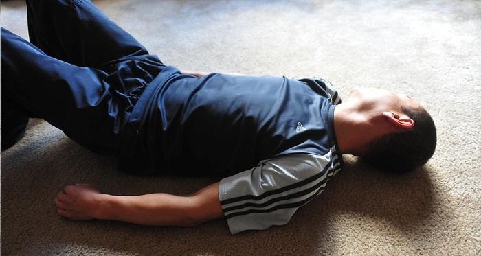3. После опускания головы мягко на землю, отдохните, положив руки по бокам. Почувствуйте, как проходит напряжение в нижней части спины, значит - искривление уменьшается. Подвигайте медленно и плавно головой, из стороны в сторону. Если хотите, повторите предыдущий шаг.