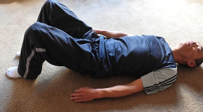 1. Лягте на спину, согните ноги в коленях и поставьте стопы на пол. Лежите так, пока спина не начнет расслабляться. Сделайте глубокий расслабляющий вдох и перейдите к шагу 2.