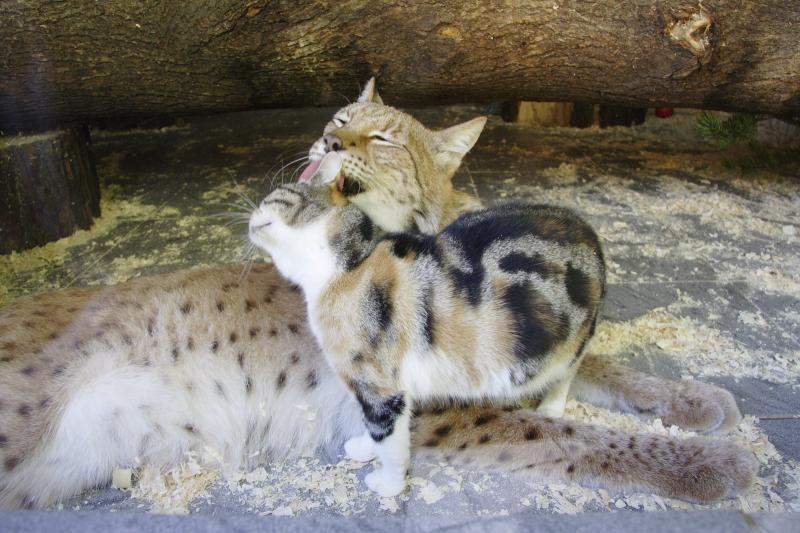 Поселили Линду и Дусю не сразу. Несмотря на незначительную разницу в размерах котят, сотрудники переживали, что животные могут не поладить. Поэтому первое время их постепенно знакомили – оставляли ненадолго в одном помещении, чтобы рысь и кошка могли узнать друг друга, привыкнуть и вместе поиграть. Это общение происходило в присутствии сотрудников, которые внимательно наблюдали за поведением кошек. И только когда зоологи были уверены, что животные привыкли друг к другу и поладили, их посадили в один вольер.