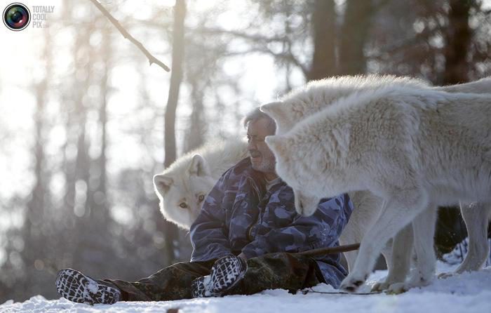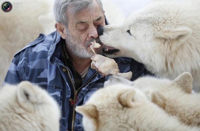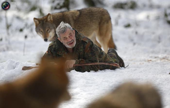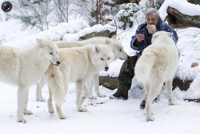 Вернер Фройнд с Полярными волками в немецком Мерциге, 24 января 2013 года. Когда он заходит на их территорию, то первым делом направляется в сторону вожака стаи или к его самке, если поступить иначе, то это может быть расценено как угроза стае, установившейся иерархии.