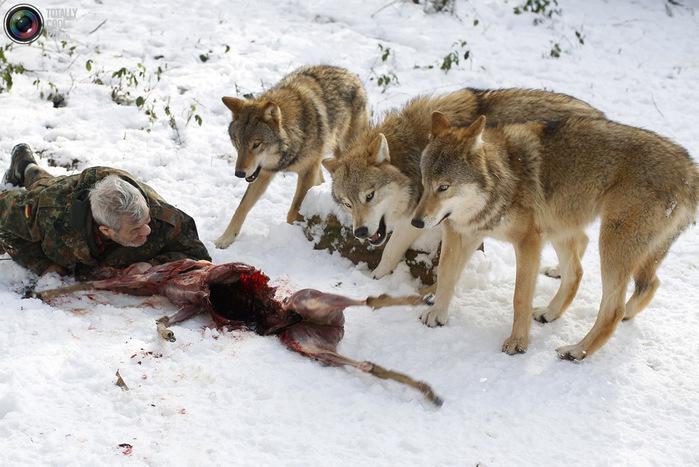 Иерархия, жесткая дисциплина — один из главных волчьих законов. Раньше Вернер Фройнд рвал зубами тушу косули или овцы на глазах терпеливо дожидающейся своей очереди голодной стаи. Теперь же ему достаточно какое-то время просто подержаться за добычу руками, а затем, показав что та его больше не интересует, отдать на растерзание волкам.