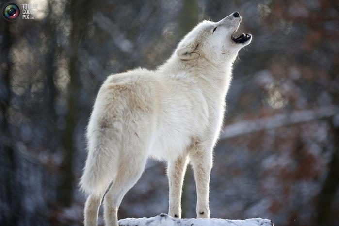Вой Полярного Арктического волка. Высота в холке: 75—100 сантиметров, масса: 80-100 килограмм (самки меньше). Способен продержаться без пищи несколько недель, но потом может съесть за один прием до 10 килограммов мяса.