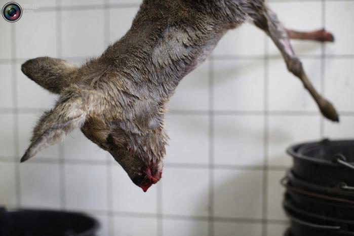 Туша убитого оленя висит в помещении в Парке волков Вернера Фройнда в Мерциге, Германия.