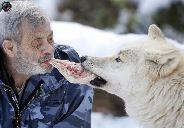 Вернер кормит Арктических волков мясом изо рта.