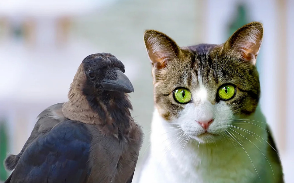Кот в ужасе пискнул и мгновенно позабыл об охоте. Он прижался спиной к стенке дома, находившейся прямо за ним, и уставился на то что было перед ним. Это был птенец. Воронёнок. Подросший, но ещё не умеющий летать.