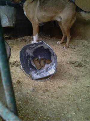 В «мисках», которыми служат грязные старые дырявые ведра, вода желто-зеленого цвета на донышке.