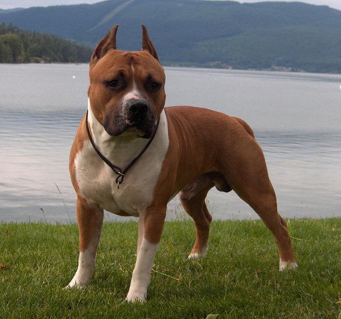 Стаффордширский терьер (амстафф) – смесь терьера и бульдога, выведен в США. Очень сильно развита мускулатура. Обладают уникальным умением различать запахи. Животные невероятно преданны, совершенно не ощущают боли. При правильном подходе хорошо дрессируются.