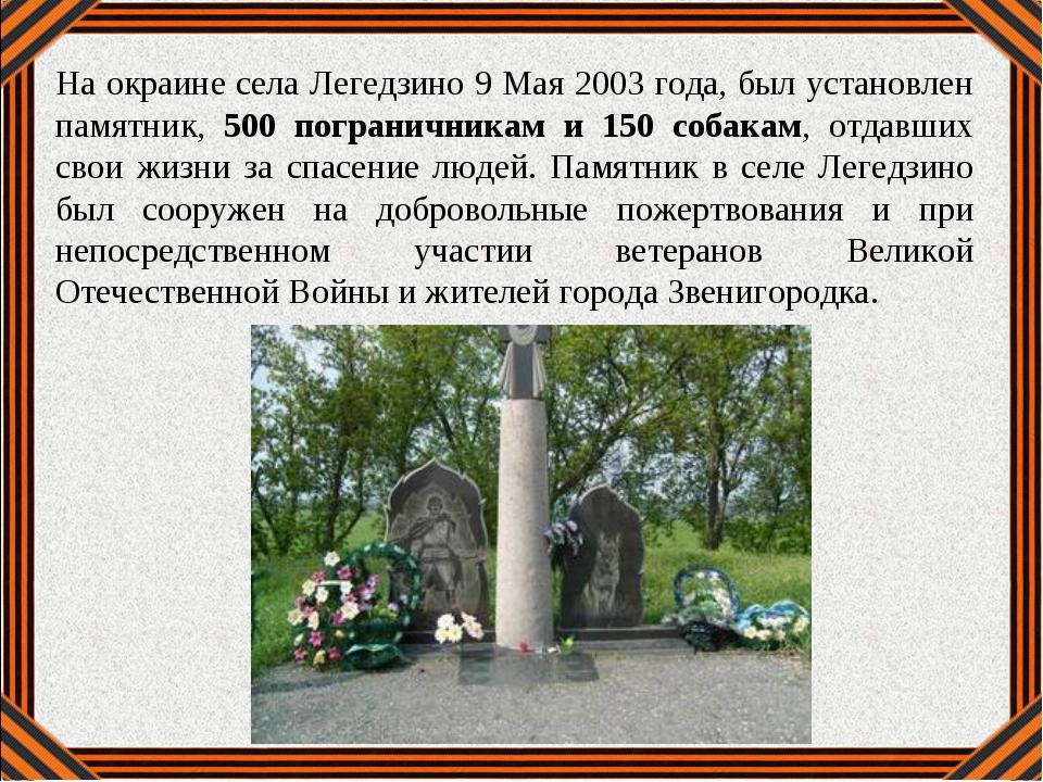 Прошли годы и благодарные потомки 9 мая 2003 года на окраине села установили памятник в честь пограничников и их четвероногих помощников.