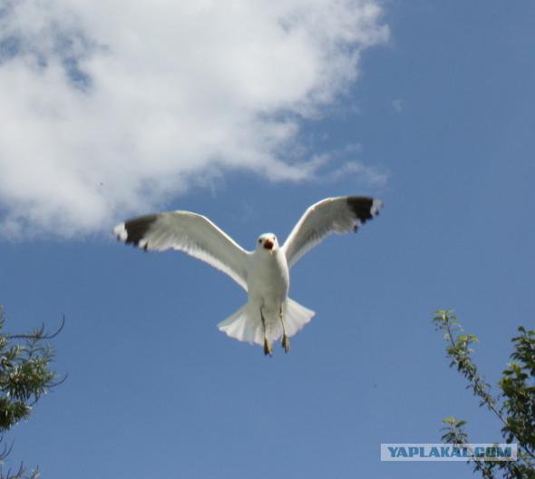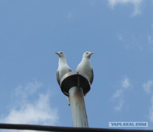 Потом чаёнка нашли родители! Прилетели сначала две чайки, долго кружили и орали над домом, а чаёнок им орал в ответ. Они с утра до вечера летали над домом, а порой прилетала целая стая чаек. Соседи жутко ругались, крики чаек было слышно за километр.