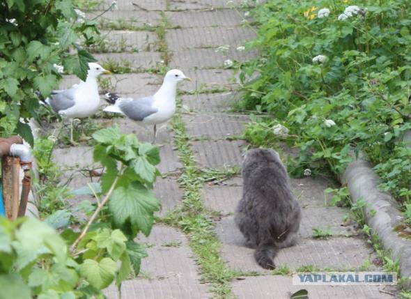 Через пару недель чайки — мама и папа стали спускаться на землю, людей они шугались, а вот с котом Степанычем они подружились!