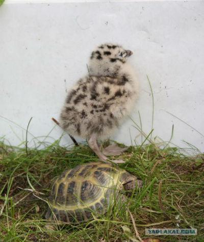 Сначала на день выпускали чайку в вольер к черепашке, но вскоре он стал оттуда выпрыгивать. А коты ходили за ним следом и охраняли его. Это было невероятно!