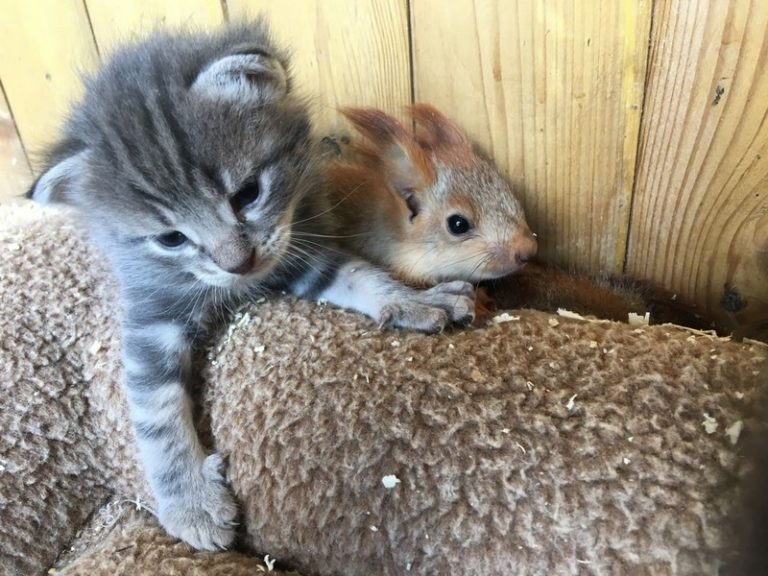 Ура, все получилось: многодетная семья из 3 бельчат и 4 котят! В итоге все довольны и счастливы.