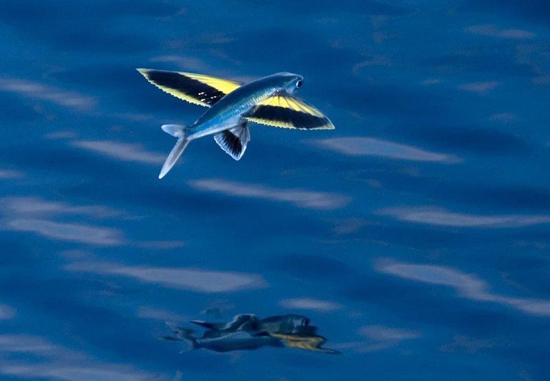 Это удивительное существо способно передвигаться в двух стихиях, отличных друг от друга – воде и воздухе. И речь идет о летучих рыбах. Само их строение, которое включает в себя большие грудные плавники, позволяет им планировать над водной гладью, что они и делают, выпрыгивая из воды. А если ветер над поверхностью достаточно сильный, чтобы поддерживать полет рыбки, то она может пролетать сотни метров.