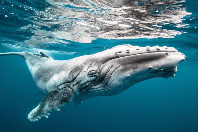 Горбатый кит очень необычной внешности. На его спине вырос плавник, который напоминает горб, а на голове находятся кожистые выступы. Длиной в среднем 13-14 метров и весом 30 тонн, но редкие особи вырастают до 18 метров. Встречаются во всех океанах, кроме Арктики и Антарктики.