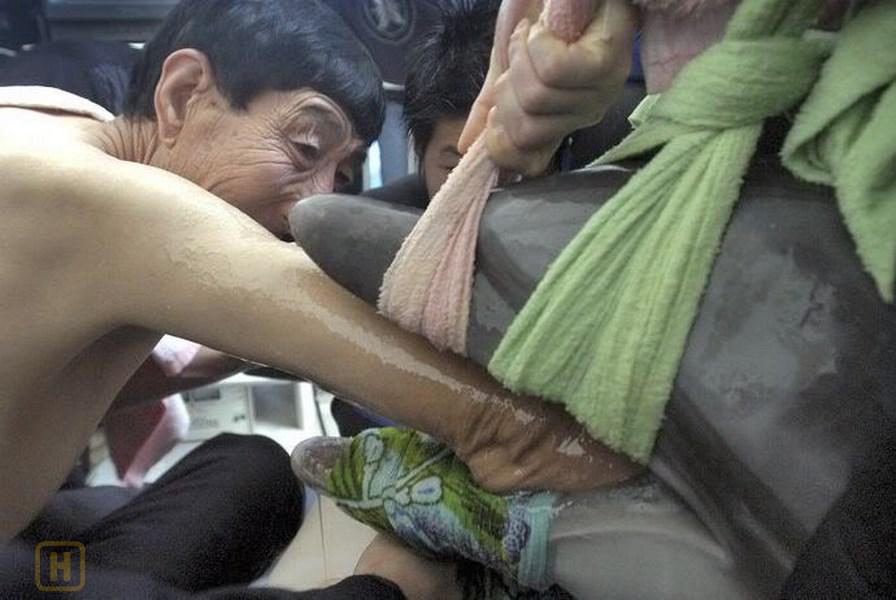 Вскоре дельфины почувствовали себя намного лучше. Чтобы животные случайно не оттяпали гиганту руку, между челюстями вставили специальные подпорки. Кроме того, десяти дюжих ассистентов, пока Бао копошился в желудках дельфинов, крепко прижимали их к полу "операционной". Благодаря своим длинным рукам (1,06 м) мужчина спас жизнь двум дельфинам.
