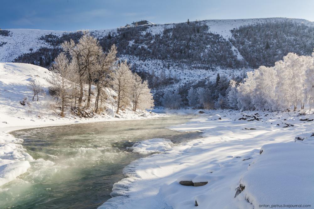 Река парила в зимнем морозце. Первый раз видел Алтай в таком зимнем наряде. Да еще и снега навалило в тех местах, где его зимой не бывает.