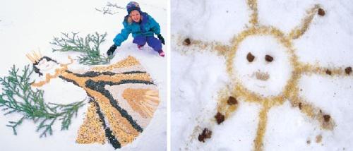 С помощью крупы можно на снегу выложить различные рисунки, вашему ребенку наверняка понравится такой необычный способ рисования, а птичкам — их накрытый стол:)