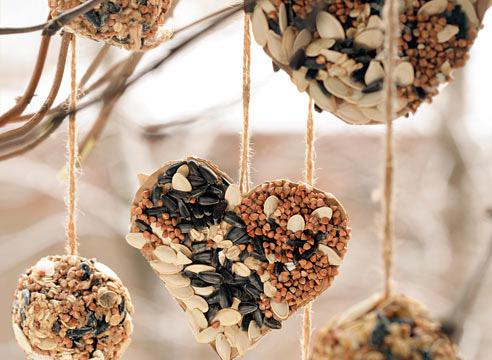 Если на улице держится минусовая температура, то на деревья можно повесить ледяные венки с угощениями. Положите кормовую смесь в форму для выпечки, залейте водой и поставьте в морозилку.