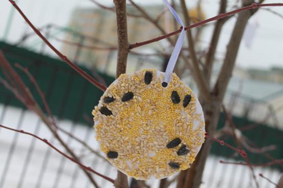 На ветки дерева можно насадить или подвесить несоленое сало — любимое лакомство синичек и дятлов. Также птицы будут рады головкам подсолнухов, если они у вас остались с дачного сезона.