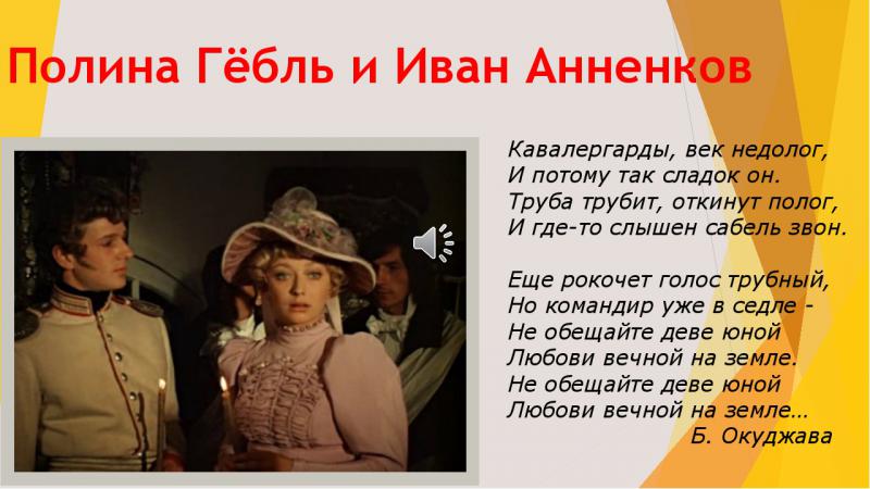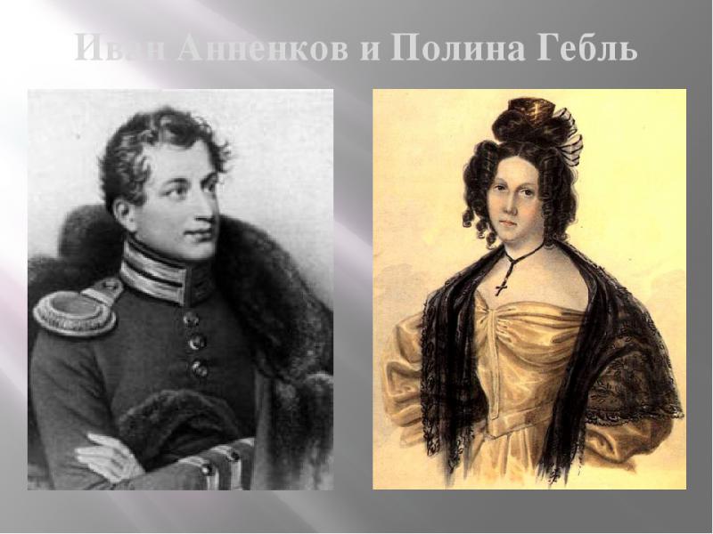 Но историю Полины Гёбль и ее мужа, декабриста Анненкова, можно назвать самой поэтичной. Эта сказочная, все превозмогающая любовь стала не только темой разговоров в великосветских салонах того времени, но и сюжетом для романа Александра Дюма «Учитель фехтования», оперы А. Д. Шапорина «Декабристы» (ее первая редакция называлась «Полина Гёбль»)., а также прообразом для героев всеми нами любимой картины "Звезда пленительного счастья"